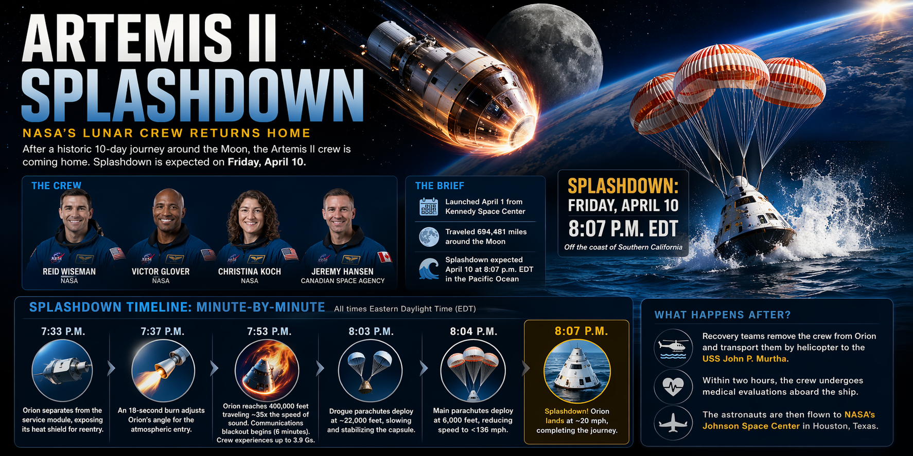 Astronauts Reid Wiseman, Victor Glover, Christina Koch, and Jeremy Hansen are expected to splash down in the Pacific Ocean off Southern California at around 8:07 p.m. EDT on Friday, April 10, wrapping up a 10-day, nearly 700,000-miles around the Moon.